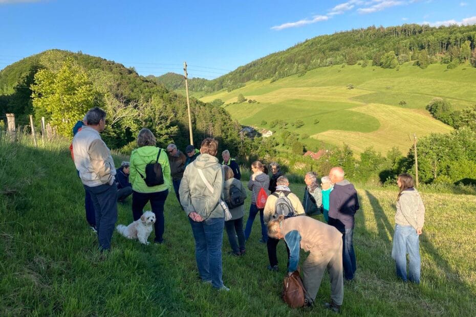 Freitag, 23. Mai 2025, Langenbruck Weiefäckte… und wie seisch Du? Auf diesem gemütlichen Abendspaziergang Richtung Dürstel zeigte uns Susanne Kaufmann Wildfplanzen am Wegrand. Die Botanikerin und Co-Autorin des Buches „Dittiblache und Hemmliglunggi“ erzählte Wissenswertes und Kurioses rund um die Wildpflanzen und ihre Mundartnamen im Baselbiet.